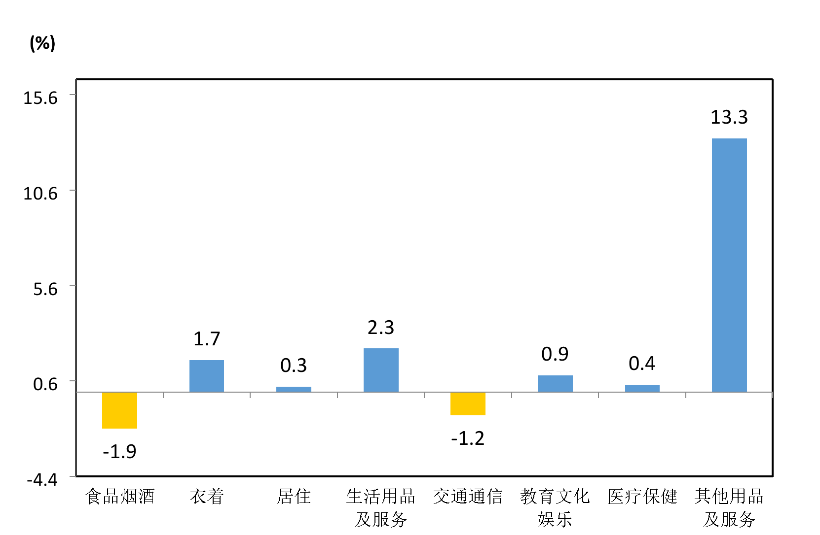 10月份,其他用品及服务、生活用品及服务、衣着、教育文化娱乐、医疗保健、居住价格分别上涨13.3%、2.3%、1.7%、0.9%、0.4%和0.3%;交通通信、食品烟酒价格分别下降1.9%和1.2%。