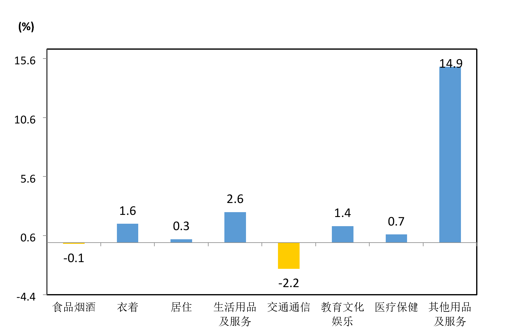 其他七大类价格同比六涨一降。其中,其他用品及服务、生活用品及服务、衣着、教育文化娱乐、医疗保健、居住价格分别上涨14.9%、2.6%、1.6%、1.4%、0.7%和0.3%;交通通信价格下降2.2%。
