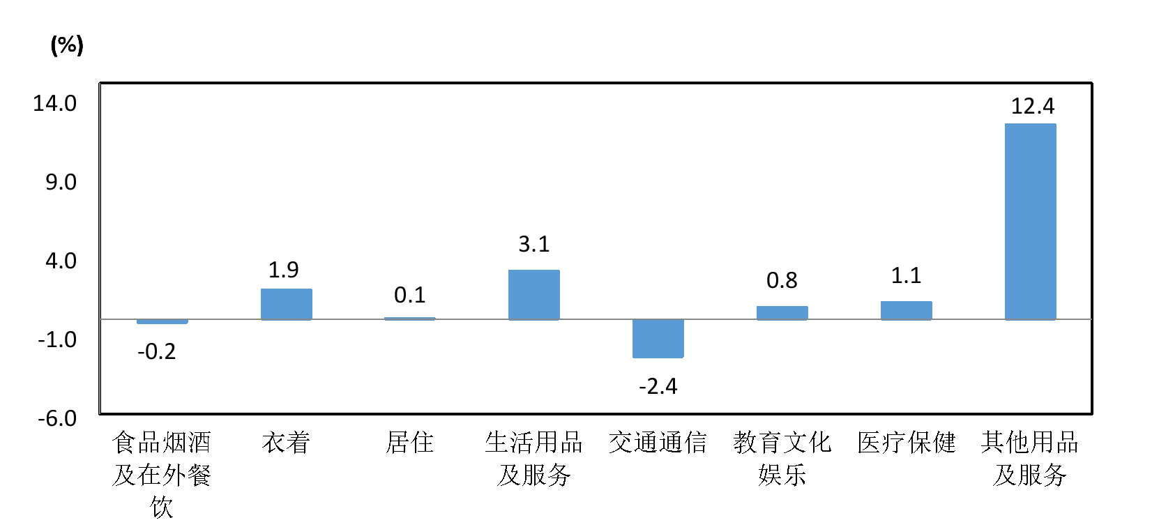 其他七大类价格同比六涨一降。其中,衣着、居住、生活用品及服务、教育文化娱乐、医疗保健、其他用品及服务价格分别上涨1.9%、0.1%、3.1%、0.8%、1.1%和12.4%;交通通信价格下降2.4%。