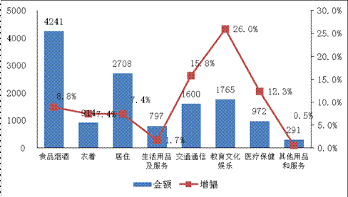 图1 2014年湖南居民各项消费支出值与增幅