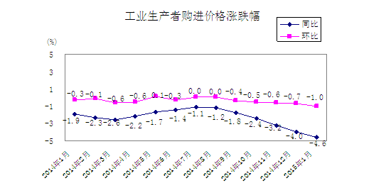 2015年1月份,全省工业生产者出厂价格同比下降2.8%,环比下降0.4%。工业生产者购进价格同比下降4.6%,环比下降1.0%。