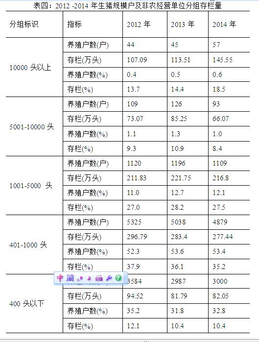 湖南规模化养殖呈加速发展趋势。2014年生猪规模户(期末存栏生猪400头以上)共8301户,比2013年增长1.6%,比2012年增长2.67%。由于2014年亏损期达7个月之久,部分中小规模户缩减产能以减少亏损,以致存出栏有所下降。2014年存栏生猪551.15万头,比2013年下降2.4%,比2012年下降2.6%。2014年出栏生猪945.07万头,比2013年下降3.9%,比2012年下降4.5%。