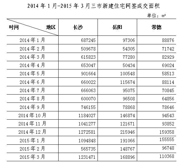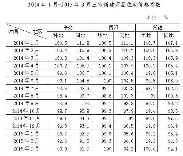 2015年一季度长沙岳阳常德房地产市场供求及价格运行情况