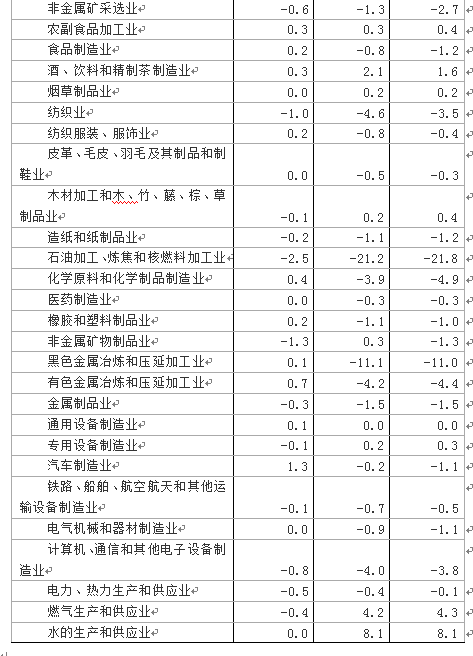 工业生产者购进价格中,黑色金属材料类价格下降8.5%,燃料动力类价格下降11.4%,有色金属材料及电线类价格下降3.3%,化工原料类价格下降2.2%。