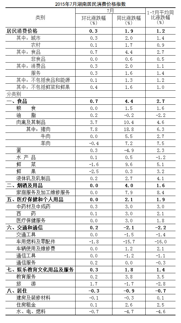 7月份,湖南居民消费价格总水平同比上涨1.9%。其中,城市上涨2.0%,农村上涨1.7%;食品价格上涨4.4%,非食品价格上涨0.6%;消费品价格上涨2.0%,服务价格上涨1.6%。