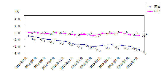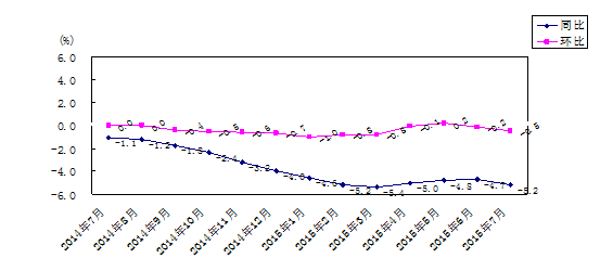 7月份,湖南工业生产者出厂价格同比下降3.9%,环比下降0.7%;工业生产者购进价格同比下降5.2%, 环比下降0.5%。