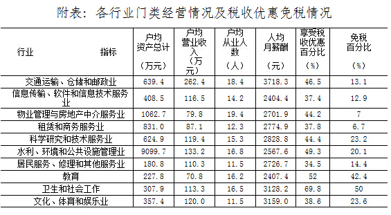 上半年,1679家规模以下服务业企业中,执行营业税的企业占52.2%,比上年同期减少10.7%;执行增值税的企业占27.7%,比上年同期增长2.9%;免税的企业占20.1%,比上年同期增长7.8%。免税企业增多,“营改增”效果显现。另外44.8%的企业认为享受了税收优惠政策,比上年同期增长4.1%。各门类中,卫生和社会工作享受了税收优惠政策的企业比率和免税的企业比率都为最高,享受税收优惠的达69.8%;免税的达50%。