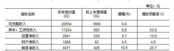 人均工资性收入11254元,增长8.6%,对收入增长的贡献率为53.8%,拉动可支配收入上涨4.7个百分点。其增长的影响因素主要有三个方面: