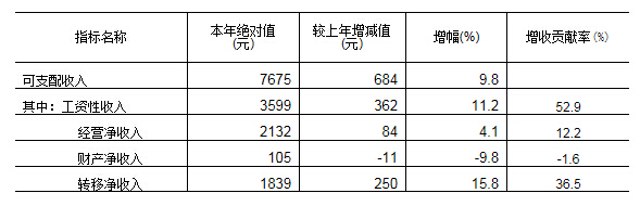 2.劳动力价格上升,带动农村居民外出务工收入增加,寄回带回收入快速增长。人均寄回带回收入939元,增长19.6%。