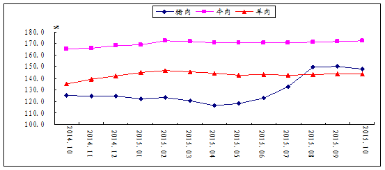 图2 猪肉、牛肉、羊肉价格变动情况(2010年12月价格=100)