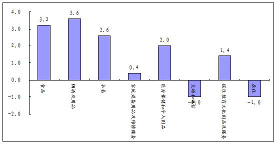 居住价格同比下跌1.0%。其中,住房租金价格上涨2.1%,建房及装修材料价格下跌0.4%,水、电、燃料价格下跌4.4%。