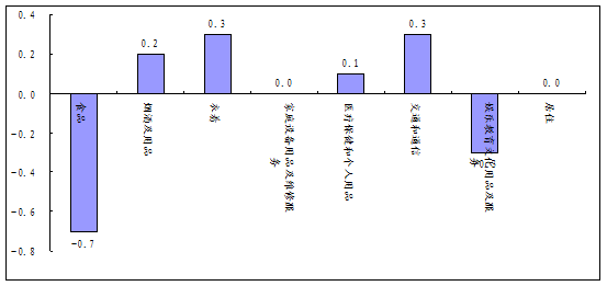 非食品价格环比上涨0.1%。衣着类、交通和通信类价格均上涨0.3%;烟酒类价格上涨0.2%;医疗保健和个人用品类价格上涨0.1%;娱乐教育文化用品及服务类价格下跌0.3%;家庭设备用品及维修服务类、居住类价格与上月持平。