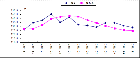 图3 鲜菜、鲜果价格变动情况(2010年12月价格=100)