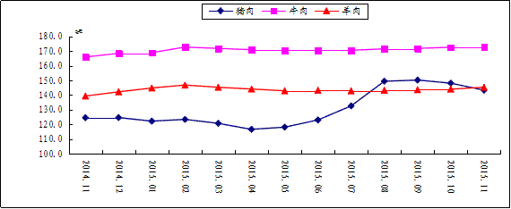 11月份,食品价格同比上涨2.8%,影响居民消费价格总水平上涨约0.98个百分点。其中,鲜菜价格上涨2.1%,影响居民消费价格总水平上涨约0.08个百分点,肉禽及其制品价格上涨8.3%(猪肉价格上涨15.0%,影响居民消费价格总水平上涨约0.64个百分点),粮食价格上涨1.7%,蛋类价格下降6.8%,水产品价格下降1.4%,鲜果价格下降1.5%。
