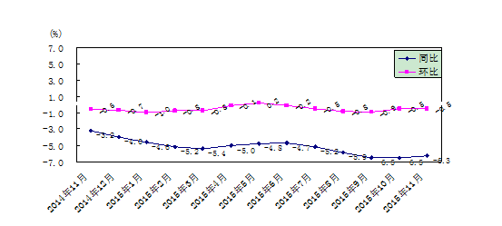 11月份,湖南工业生产者出厂价格同比下降4.8%,环比下降0.6%;工业生产者购进价格同比下降6.3%, 环比下降0.5%。1-11月,湖南工业生产者出厂价格下降3.6%。
