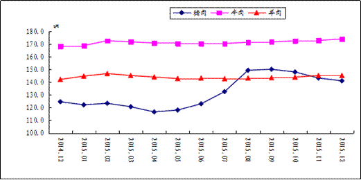 图2 猪肉、牛肉、羊肉价格变动情况(2010年12月价格=100)