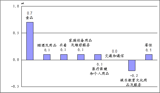 非食品价格环比与上月持平。其中烟酒类、衣着类、家庭设备用品及维修服务类、医疗保健和个人用品类、居住类价格均上涨0.1%;娱乐教育文化用品及服务类价格下跌0.2%;交通和通信类价格与上月持平。