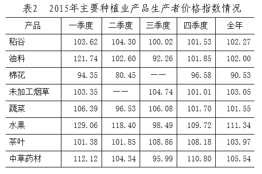 种植业产品价格比上年上涨1.5%。其中,稻谷、油料、未加工烟草、蔬菜、水果、茶叶和中草药材的价格均有所上扬,棉花价格下跌(见表2)。