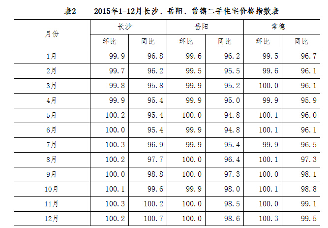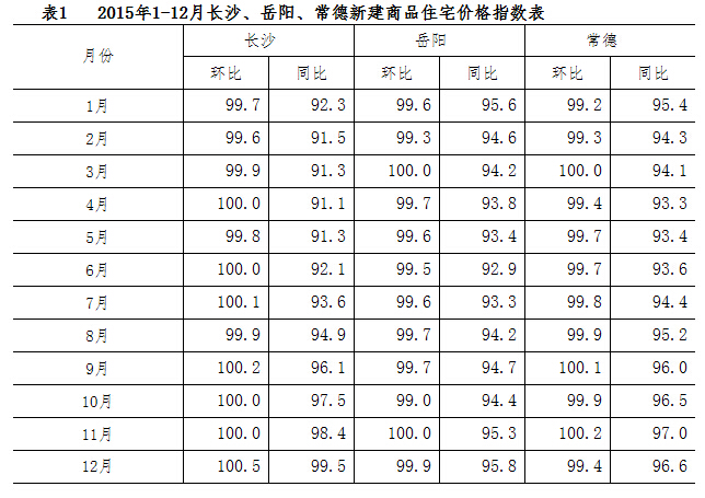 国家统计局城市司反馈数据显示,从2015年4月开始,长沙和常德新建商品住宅同比价格降幅逐月明显收窄。长沙从4月份的下降8.9%缩小到12月份的下降0.5%;常德从4月的下降6.7%缩小到12月的下降3.4%;岳阳同比指数在2015年6月达到7.1%的最大降幅后,逐步缩小到12月份的下降4.2%。环比走势各市基本相同,在2015年三、四月份达到100,之后各月维持在100附近徘徊。