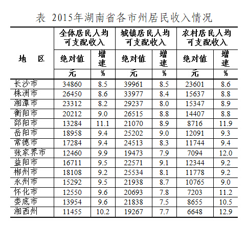 根据国家统计局湖南调查总队会同湖南省统计局组织的湖南分市县住户收支与生活状况调查,2015年14个市州中居民人均可支配收入超过20000元的地区有长沙市、株洲市、湘潭市和衡阳市,低于13000元的有张家界市、怀化市和湘西土家族苗族自治州。城镇居民人均可支配收入超过29000元的地区有长沙市、株洲市和湘潭市。农村居民人均可支配收入超过10000元的有9个地区,其中长沙市、株洲市、湘潭市和衡阳市的农村居民人均可支配收入超过14000元。农村居民人均可支配收入最低的湘西土家族苗族自治州为6648元,仅为长沙市的28.2%。