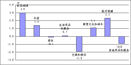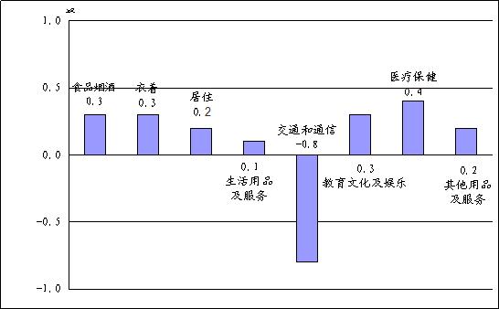 非食品烟酒价格环比上涨0.1%。其中医疗保健类价格上涨0.4%;衣着、教育文化和娱乐类价格均上涨0.3%;居住、其他用品和服务类价格均上涨0.2%;生活用品及服务类价格上涨0.1%;交通和通信类价格下跌0.8%。