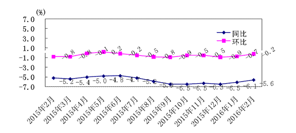图1 工业生产者出厂价格涨跌幅(2015.2-2016.2)