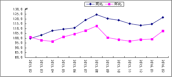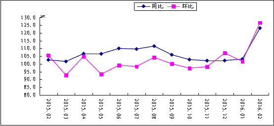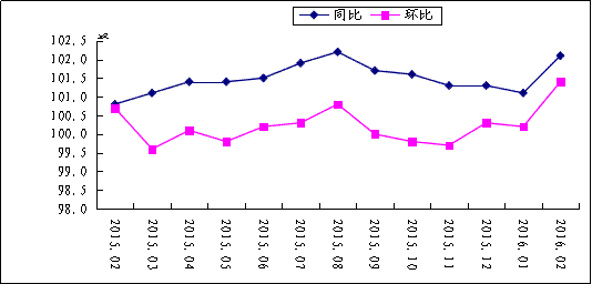 图1 湖南消费价格涨跌幅(2015.02-2016.02)