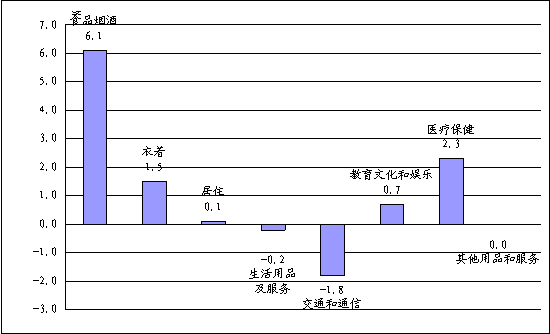 交通和通信价格同比下跌1.8%。其中,交通工具燃料价格下跌6.7%,交通工具价格下跌2.7%,通信工具价格下跌 1.1%,交通工具使用及维修价格上涨0.2%,通信服务下跌 0.6%。