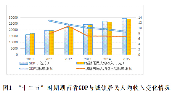 “十二五”时期,湖南城镇居民人均可支配收入步入增速逐渐放缓,结构优化升级的新常态。与“十一五”相比,居民收入年均增幅降低0.8个百分点,实际年均增速降低0.5个百分点。2012年湖南省GDP总量突破两万亿,同年城镇居民人均收入也超过两万元。城镇居民收入增长受经济增速影响呈放缓态势,湖南GDP增速从最快时的12.8%降至8.6%,城镇居民收入增速从最快时的10.7%下降至6.9%。