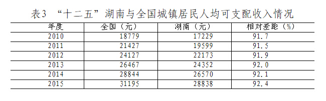 2010年,全国城镇居民人均可支配收入为18779元,湖南为17229元,相当于全国平均水平的91.7%;2015年全国城镇居民人均可支配收入为31195元,湖南为28838元,相当于全国水平的92.4%。经过五年时间,湖南城镇居民收入与全国平均水平的差距缩小了0.7个百分点。
