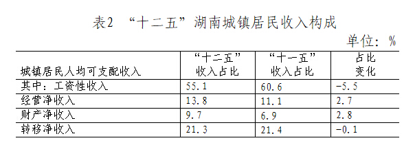 城镇居民经营净收入年均实际增长12.7%,增速较快。“十二五”时期,湖南积极落实国家“三证合一”制度和“负面清单”等改革政策,主动简政放权,出台措施降低小微企业和商户经营成本,优化经营环境,努力提高城镇居民创业积极性,为居民经营收入增长创造了良好的条件。