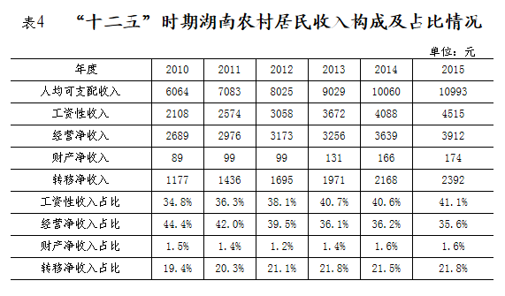3.明显快于“十一五”时期农村居民收入增速。“十二五”时期湖南农村居民收入的实际增速提速较明显,年均实际增速较“十一五”时期的8.8%快1.2个百分点。