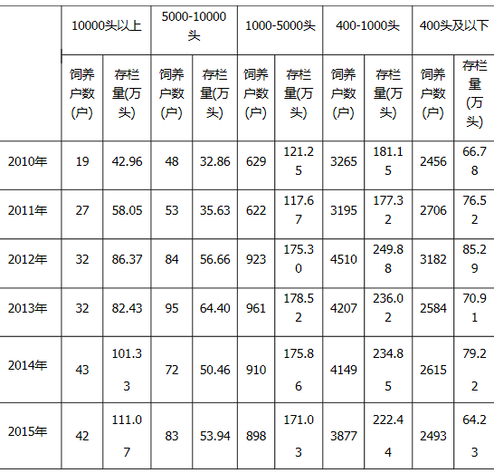 2015年,中小规模养殖户(存栏1000头以下)占规模户及非农单位的比重为86.1%,较2010年的89.2%下降3.1个百分点;但中小规模养殖户2015年户均存栏为450.0头,较2010年的430.1头有所增加。另外,从表1可看出,“十二五”时期,中小规模户数量在2012年达到顶峰后逐年递减。这是由于2011年行情大好,养殖户获利颇丰,促使大量社会资本在2012年涌入养殖业,养殖户数量猛增,但随着市场行情的转弱,部分中小规模户又逐渐退出养殖业。
