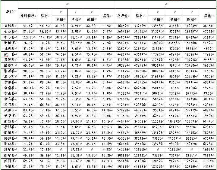 2015年,根据国家统计局的统一部署,国家统计局湖南调查总队对全省65个粮食生产大县组织开展了县级粮食产量抽样调查,并严格按照国家统计局统一制定的推算方法进行推算。经国家统计局核准,2015年湖南粮食生产大县的粮食播种面积和总产量如下: